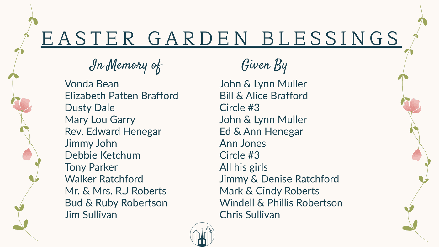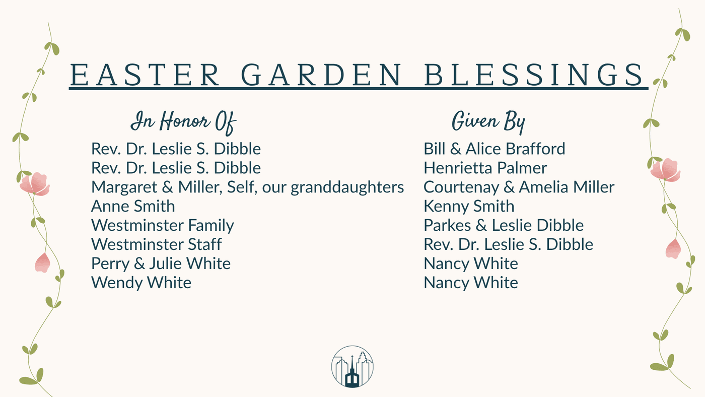 Monetary gifts that were given this Easter in honor or memory of others will be used for enhancement of the garden and our natural areas.